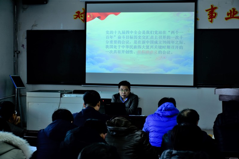 本网讯(通讯员 王潇猇)2019年11月20日,结合“不忘初心、牢记使命”主题教育,金沙城js9线路检测中心开展《解读学习学习四中全会精神》专题党课,党课由学院党委书记李奇涵主讲,学院全体教师参加了学习。