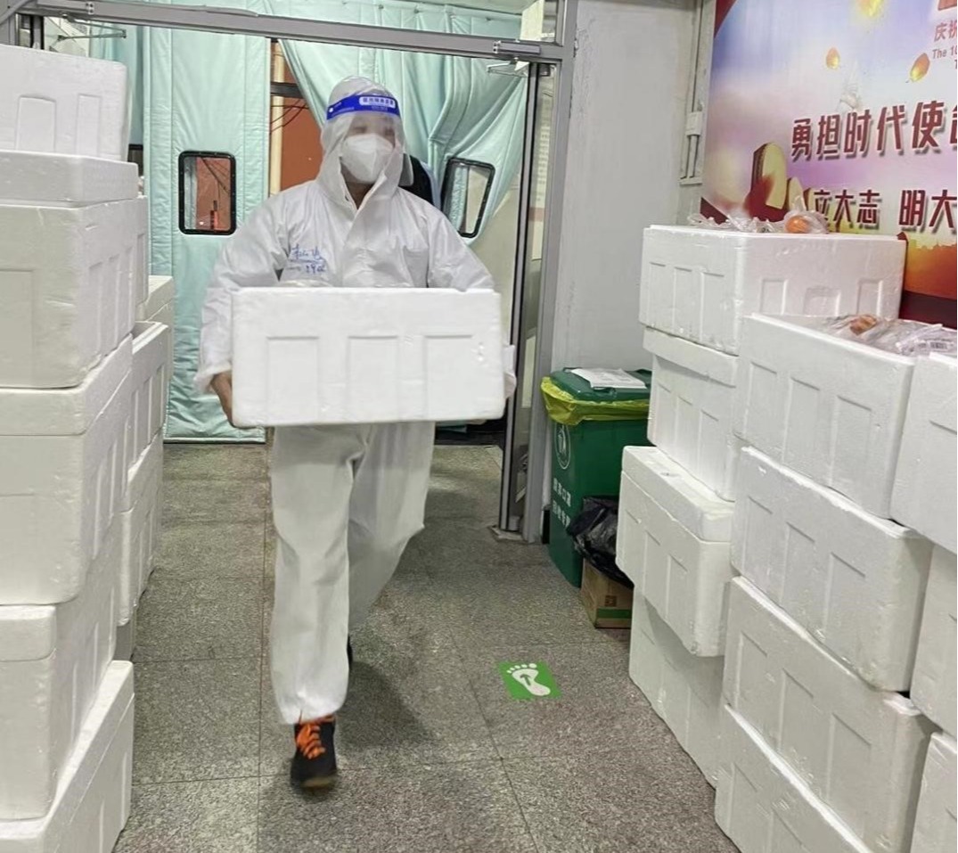 驻校辅导员赵宝贵、毛燕龙同志搬运学生物资