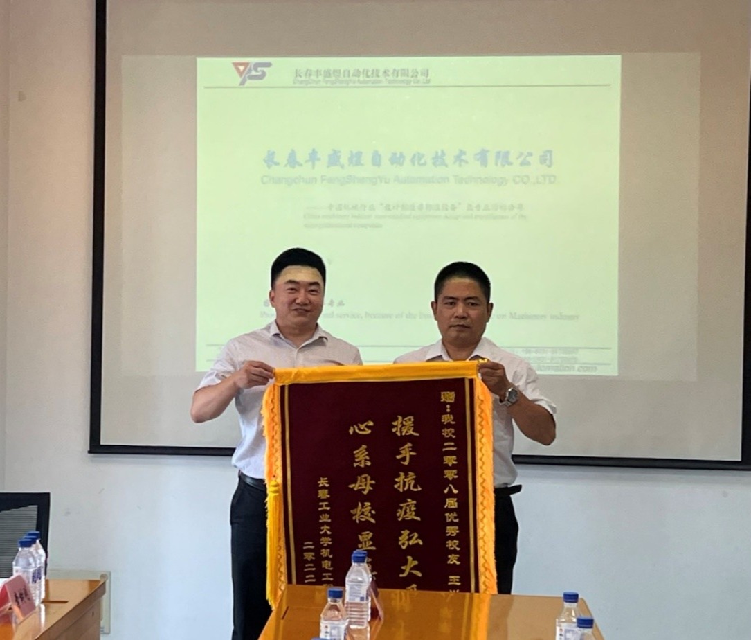 我院2004级校友、公司董事长王兴中对母校老师的到访表示热烈欢迎,并对公司发展情况、产品研发能力、发展战略及人才需求进行了介绍。李奇涵就学院整体情况、学生培养、专业建设、实习实训基地建设及产学研合作情况等进行了介绍,并对疫情防控期间王兴中先生对母校的物资捐赠表示衷心感谢,于保军向王兴中先生颁发抗疫捐赠证书,黄向东代表学院向长春丰盛煜公司赠送锦旗。