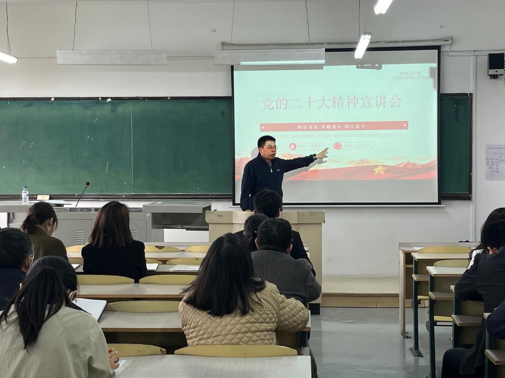 李奇涵围绕深刻领悟党的二十大隆重召开的重要意义、党的二十大主题和主要成果、大会报告内容等方面开展宣讲,重点阐释了过去五年的工作和新时代十年的伟大变革、实施科教兴国战略,强化现代化建设人才支撑等内容,并结合学院工作实际,就如何做好全面贯彻党的教育方针,落实立德树人根本任务,提升人才自主培养能力,坚持为党育人、为国育才,打造尊重劳动、尊重知识、尊重人才、尊重创造的良好氛围等方面讲了具体的实施思路。