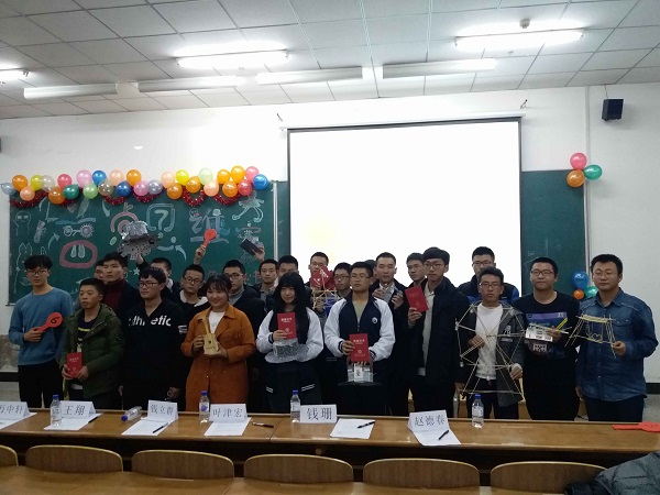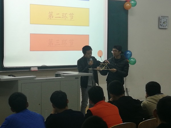 本次大赛旨在加强同学的动手能力和专业素养,要求学生小组合作,在有限材料的条件下设计并制作出具有创造性和实用性的机械结构。同学们使用简单的竹签、橡皮筋等发挥个人创意,制作出了埃菲尔铁塔、摩天轮、投石车等造型。比赛中选手分别讲述了自己的作品的创意来源,修改经过,以及完善结果,使在场的同学们了解到了一个创意从雏形到成品的过程。极大的鼓舞了同学们的创作热情和动手热情。最终,160103班的赵嘉颖慧小分队在决赛中力压群雄,夺得冠军。