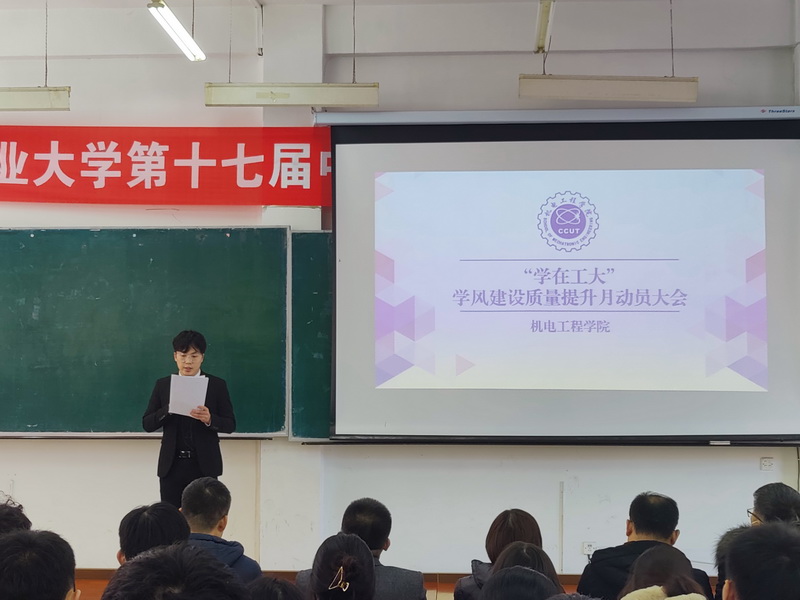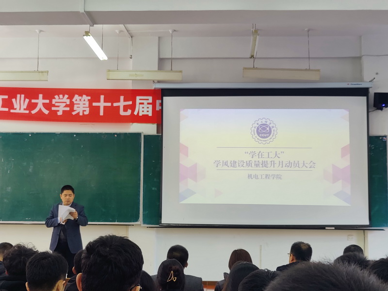 本网讯(通讯员 袁德禄)为了进一步贯彻学校学风建设质量提升月工作要求,加强学风建设,营造浓厚的学习氛围。11月24日中午,我院在南湖校区综合一教室隆重召开“学在工大”学风建设质量提升月动员大会。学院党委书记李奇涵、院长岳晓峰、党委副书记黄向东、学院其他相关领导,各系党支部书记、系主任,全体辅导员和全体学生干部参加了本次大会。
